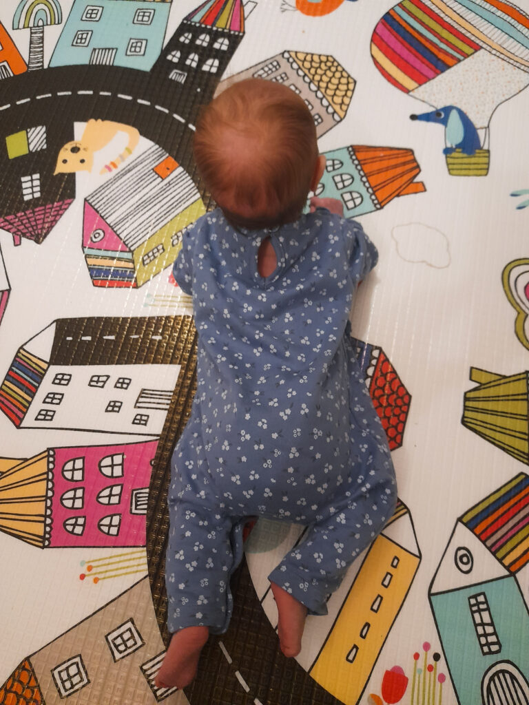 Teraz coś co w moim przekonaniu jest bardzo ważne i niezbędne do prawidłowego rozwoju każdego malucha. Miejsce zabawy, poznawania świata i zdobywania nowych umiejętności- mata piankowa. Tak na prawdę możemy ją wykorzystywać już od samego początku. Na start nie musi być duża, ale stosunkowo miękka oraz o nieślizgającej się zbyt mocno powierzchni. Najlepiej nie nad wyraz kolorowa, bo w połączeniu z zabawkami, których na niej będzie przybywać, będzie dawała dziecku zbyt intensywne bodźce wzrokowe(często można znaleźć maty dwustronne, gdzie jedna strona jest bardziej, druga mniej kolorowa). Stanowisko do zabawy na początku nie potrzebuje zbyt wielu elementów, głównie rodzic i dziecko. Ewentualnie zabawki i książeczki kontrastowe oraz jakaś delikatna grzechotka. Najlepszej zabawy maluchowi dostarczą nasze ręce i kolana, dlatego pamiętajmy, żeby matę umieścić w miejscu, gdzie będziemy mogli wesprzeć wygodnie również nasze plecy. Z czasem zabawek i skarbów będzie przybywać, mata będzie się rozrastać, aż do momentu jak nasz mały eksplorator zacznie przeszukiwać pomieszczenia wzdłuż i wszerz 🙂